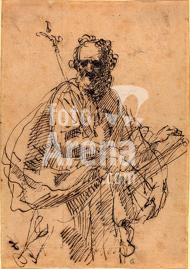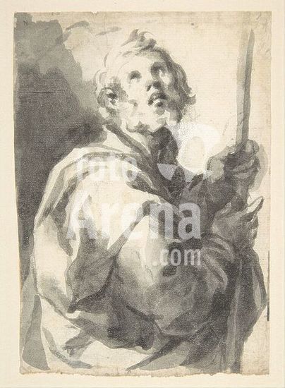 alb3620040 Male Saint with Staff, Half-Figure. Artist: Attributed to Francisco Herrera, the Younger ("El Mozo") (Spanish, Seville 1627-1685 Madrid). Dimensions: 6-1/16 x 4-1/2 in. (15.4 x 11.4 cm). Date: 1640. Museum: Metropolitan Museum of Art, New York, USA.