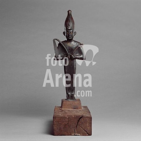 alb3635347 Osiris offered by the Astronomer of the House of Amun, Ibeb. Dimensions: Statue above base H. 35 cm (13 3/4 in); W 12.2 cm (4 13/16 in); D 9 cm (3 9/16 in);Base H. 9.5 cm (3 3/4 in); W 13.4 cm (5 1/4 in); D 26.2 cm (10 5/16 in). Dynasty: Dynasty 21-24. Date: ca. 1070-712 B.C..This statuette was excavated at Hiba (or Teudjoi), a fortress town south of Herakleopolis, in Middle Egypt, and an important outpost at the northern limits of the Theban controlled part of the country from the late New Kingdom through the Third Intermediate Period. The site has not been thoroughly examined archaeologically, but the Theban High Priests (and sometime kings) seem to have had a residence at El-Hiba, and King Sheshonq I (r. ca. 945-924 B.C.) built a temple of Amun there. The statue is preserved on its original wood base, which bears a hieroglyphic inscription recording the name of the donor: "the Astronomer of the House of Amun Ibeb (Ibi), Son of the Astronomer of the House of Amun Ankhpekhered." The current glossy black surface is an artificial patination applied in the 1930s. Museum: Metropolitan Museum of Art, New York, USA.