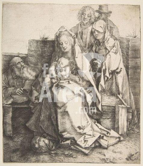 alb3635999 The Holy Family. Artist: Albrecht Dürer (German, Nuremberg 1471-1528 Nuremberg). Dimensions: Sheet: 8 1/4 x 7 1/8 in. (21 x 18.1 cm). Date: 1512-13.Dürer created only three prints in the medium of drypoint. Since the other two are dated 1512, this drypoint is presumed to date from the same time. The print was thus produced at the height of the artist's career, just prior to such famous "master prints" as the Melancholia and Knight, Death, and the Devil. Yet the composition harks back to one of the artist's earliest engravings, produced when Dürer was under the influence of the most prolific drypoint artist of the Renaissance, the Housebook Master.Produced by scratching the surface of the metal with a sharp needle, the image has the character of a delicate drawing. Apparently conceived in an experimental mode and never completed, the print is nonetheless highly evocative. The three ghostly figures who press into the space behind the Virgin and Child--Saint John, the Magdelene, and Nicodemus--do not belong to the story of Christ's childhood but, as witnesses to the Crucifixion, are a presentiment of his future suffering. The soft shadow produced by the drypoint burr shrouds the figures and deepens the melancholy atmosphere. Museum: Metropolitan Museum of Art, New York, USA.