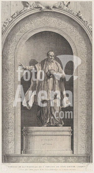 alb3636540 The Chapel of the Enfants-Trouvés in Paris: Saint Vincent de Paul. Artist: Etienne Fessard (French, Paris 1714-1777 Paris); After Charles Joseph Natoire (French, Nîmes 1700-1777 Castel Gandolfo). Dimensions: Sheet (Trimmed): 20 11/16 × 11 3/16 in. (52.5 × 28.4 cm). Date: 1756.From a series of fifteen plates engraved by Fessard after the paintings by Natoire in the Chapel of the Enfants-Trouvés, Paris. The chapel was built in 1746-50 based on designs by Germain Boffrand, but destroyed in the 19th century. The main altar depicted The Adoration of the Magi and subsidiary scenes included the children and nuns of the orphanage as onlookers. Natoire's scenes were set into trompe l'oeil surrounds painted by Paolo Antonio and Gaetano Brunetti, giving the illusion that the viewer was standing in a ruined building. Fessard's suite of prints includes a perspective view of the interior based on a drawing by Augustin de Saint-Aubin. Museum: Metropolitan Museum of Art, New York, USA.