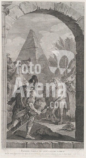 alb3648114 The Chapel of the Enfants-Trouvés in Paris: La Suite des rois mages: gardes et trompettes. Artist: Etienne Fessard (French, Paris 1714-1777 Paris); After Charles Joseph Natoire (French, Nîmes 1700-1777 Castel Gandolfo). Dimensions: Sheet (Trimmed): 20 11/16 × 11 3/16 in. (52.5 × 28.4 cm). Date: 1754.From a series of fifteen plates engraved by Fessard after the paintings by Natoire in the Chapel of the Enfants-Trouvés, Paris. The chapel was built in 1746-50 based on designs by Germain Boffrand, but destroyed in the 19th century. The main altar depicted The Adoration of the Magi and subsidiary scenes included the children and nuns of the orphanage as onlookers. Natoire's scenes were set into trompe l'oeil surrounds painted by Paolo Antonio and Gaetano Brunetti, giving the illusion that the viewer was standing in a ruined building. Fessard's suite of prints includes a perspective view of the interior based on a drawing by Augustin de Saint-Aubin. The print depicting the ceiling (Caviglia-Brunel, 2012, under *P.195, p.360) is missing from the Met's set. Museum: Metropolitan Museum of Art, New York, USA.
