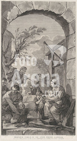 alb3656452 The Chapel of the Enfants-Trouvés in Paris: Groupe des bergers près d'un puits. Artist: Etienne Fessard (French, Paris 1714-1777 Paris); After Charles Joseph Natoire (French, Nîmes 1700-1777 Castel Gandolfo). Dimensions: Sheet (Trimmed): 20 1/2 × 11 1/8 in. (52 × 28.2 cm). Date: 1757.From a series of fifteen plates engraved by Fessard after the paintings by Natoire in the Chapel of the Enfants-Trouvés, Paris. The chapel was built in 1746-50 based on designs by Germain Boffrand, but destroyed in the 19th century. The main altar depicted The Adoration of the Magi and subsidiary scenes included the children and nuns of the orphanage as onlookers. Natoire's scenes were set into trompe l'oeil surrounds painted by Paolo Antonio and Gaetano Brunetti, giving the illusion that the viewer was standing in a ruined building. Fessard's suite of prints includes a perspective view of the interior based on a drawing by Augustin de Saint-Aubin. Museum: Metropolitan Museum of Art, New York, USA.