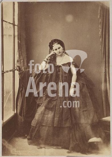 alb3659358 L'accoudée. Artist: Pierre-Louis Pierson (French, 1822-1913). Dimensions: 11.1 x 7.6 cm (4 3/8 x 3 in.). Date: 1856-57.To elongate her figure, the countess stood on a stool that is half- hidden under her dress. She would frequently use this trick of the trade. Museum: Metropolitan Museum of Art, New York, USA.