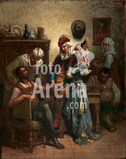 alb3682551 Don Quixote and Sancho Panza Entertained by Basil and Quiteria. Artist: Gustave Doré (French, Strasbourg 1832-1883 Paris). Dimensions: 36 1/4 x 28 3/4 in. (92.1 x 73 cm). Date: 1863?.Doré, best known as a printmaker and illustrator, often based his paintings on compositions originally created for book illustrations. This picture corresponds to an engraving that he made for an 1863 French edition of Cervantes's Don Quixote. The episode depicted is the visit paid by Don Quixote and his faithful groom to Basil and Quiteria, a young couple who had just been married owing to the knight's intervention. Museum: Metropolitan Museum of Art, New York, USA.