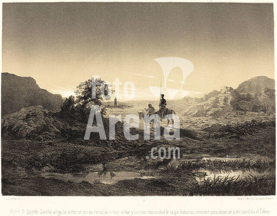 alb3702758 Dijolé D. Quijote: sancho amigo, la noche se nos va entrando... Dated: c. 1855. Dimensions: image: 21.8 x 30.4 cm (8 9/16 x 11 15/16 in.) sheet: 38.9 x 40.4 cm (15 5/16 x 15 7/8 in.). Medium: color lithograph on wove paper. Museum: National Gallery of Art, Washington DC. Author: Célestin Nanteuil.