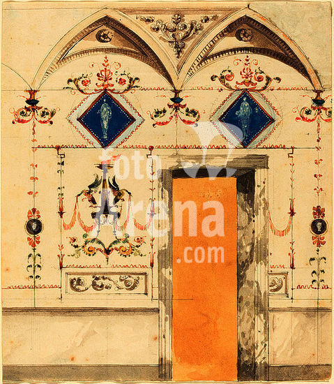alb3625413 Design for Wall Paneling and Ceiling in Pompeiian Style, Château de Deepdene. Artist: Jules-Edmond-Charles Lachaise (French, died 1897); Eugène-Pierre Gourdet (French, born Paris, 1820-1889). Dimensions: 12 7/8 x 4 1/8 in. (32.7 x 10.4 cm). Date: 1875-79. Museum: Metropolitan Museum of Art, New York, USA.