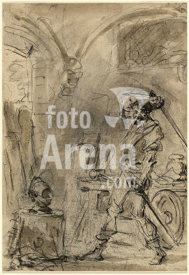 alb3737452 Don Quixote about to Strike the Helmet. Dated: 1780s. Dimensions: overall: 39.8 x 27.4 cm (15 11/16 x 10 13/16 in.). Medium: brush with brown and gray washes over charcoal on laid paper, laid down. Museum: National Gallery of Art, Washington DC. Author: JEAN-HONORE FRAGONARD.