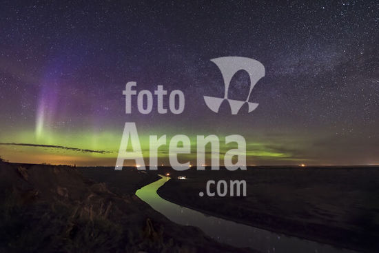 alb5567226 A faint aurora along the northern horizon and the summer Milky Way rising in the northeast, over the winding Red Deer River north of Drumheller, Alberta, Canada, on May 5/6, 2018.