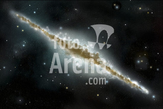 alb5567236 An artist's depiction of a large spiral galaxy viewed from edge on. Dust and gases obscure the edge of the galaxy that contains a black hole at its center.