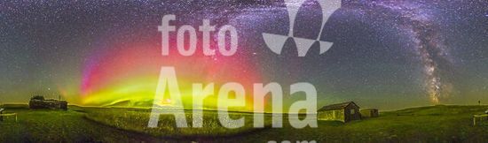 alb5568451 A 360 degree panorama taken at the old Larson Ranch site in the Frenchman River valley in Grasslands National Park, Saskatchewan, Canada. The aurora hit its substorm peak covering much of the northern sky and lighting the ground and ranch buildings green.