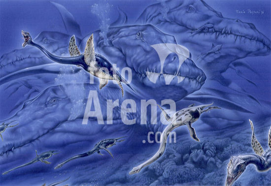 alb5568468 Kronosaurus and Elasmosaurus, among which an individual is affected by albinism. Ecoline with marten brushes and airbrush.