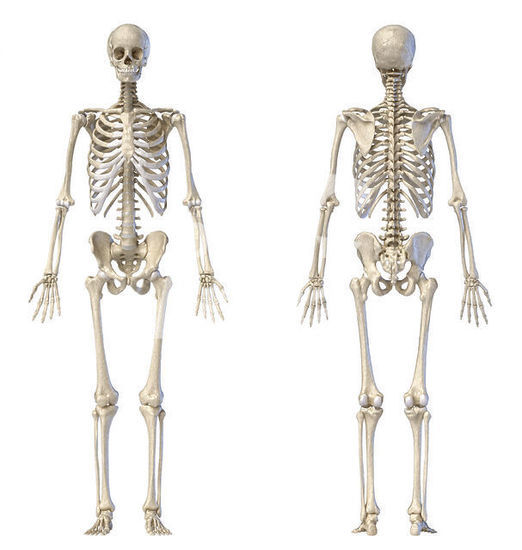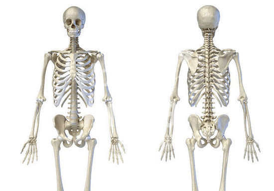 alb5568910 3D illustration of full body male skeleton. Front and rear view on white background.