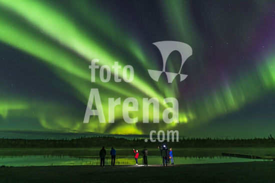 alb5568489 A group of tourists take aurora selfies at Prosperous Lake, near Yellowknife, Northwest Territories, Canada, a popular spot on the Ingraham Trail for aurora watching. This is looking west during a bright outbreak in the display this night.