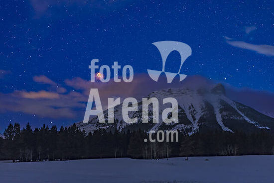 alb5568497 The total eclipse of the moon over a peak of the Continental Divide at the Crowsnest Pass area of the Canadian Rocky Mountains in southwest Alberta, Canada before dawn on the morning of January 31, 2018. The moon was setting into the west. The moon is just south (left) of the large binocular star cluster, M44, or the Beehive Cluster in Cancer.
