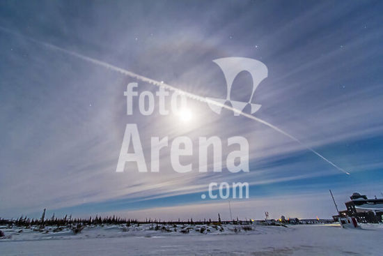 alb5568904 February 9, 2014 - An ice crystal lunar halo around the gibbous moon, with an aircraft jet contrail shooting across the scene, with a jet at far right, heading west in a polar flight over Churchill, Manitoba, Canada.