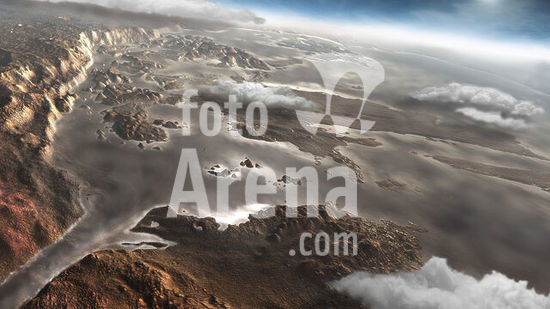 alb5568916 Aram Chaos as it appeared early in Martian history. Subterranian water has filled the crater and is flowing through a channel to the bottom left.