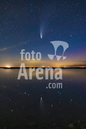alb5568918 July 20, 2020 - Comet NEOWISE (C/2020 F3) reflected in the still waters of Crawling Lake in southern Alberta, Canada. A dim aurora at right colours the sky magenta. Lingering twilight colours the sky blue. A meteor or more likely a flaring satellite appears at right and is also reflected in the water. Even in this short exposure, the two tails, dust and ion, are visible.