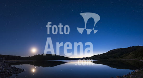 alb5568920 A panorama of the western sky in deep twilight at Reesor Lake in the Cypress Hills of southeast Alberta, in the Cypress Hills Interprovincial Park, a Dark Sky Preserve. The sky is still deep blue with twilight and the sky to the northwest bright with the last of the sunset glow. The bright object at left to the southwest is the 5-day-old waxing crescent Moon, overexposed. Jupiter is just below the Moon. Spica is below and to the left of the moon. Arcturus is the bright star at upper left. The Big Dipper is at upper right, distorted slightly due to the equirectangular map projection of the panorama stitching. Polaris is at upper right. Shot from the east end of Reesor Lake, near the dam and causeway over to the campground.