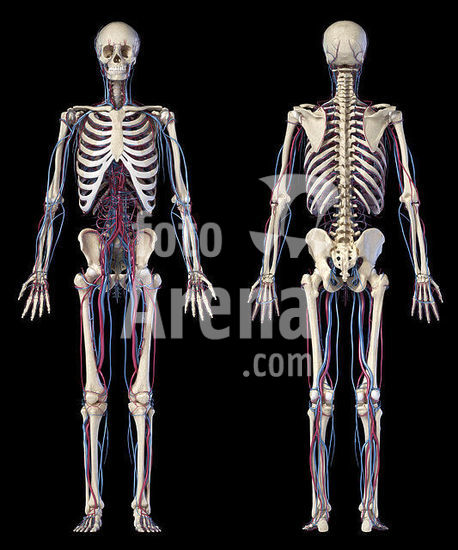 alb5568921 3D illustration of skeletal and cardiovascular systems, front and rear view, black background.