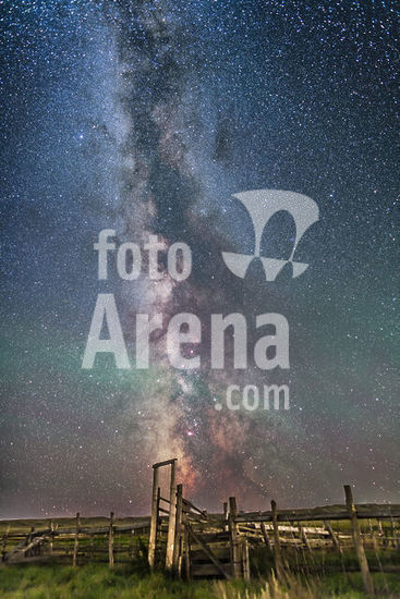 alb5568928 August 26, 2014 - The Milky Way over the old corral at the site of the 76 Ranch in the Frenchman Valley in Grasslands National Park, Saskatchewan, Canada. The foreground is lit by starlight, by the aurora brightening in the north, and by the occasional flashes of spotlights from naturalists down the valley spotting for nocturnal ferrets. The green bands in the sky are from natural airglow.