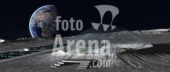 alb5568929 A domed crater is home to a lunar city. Earth rises in the background.
