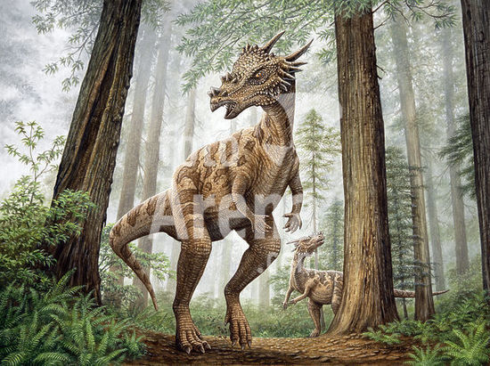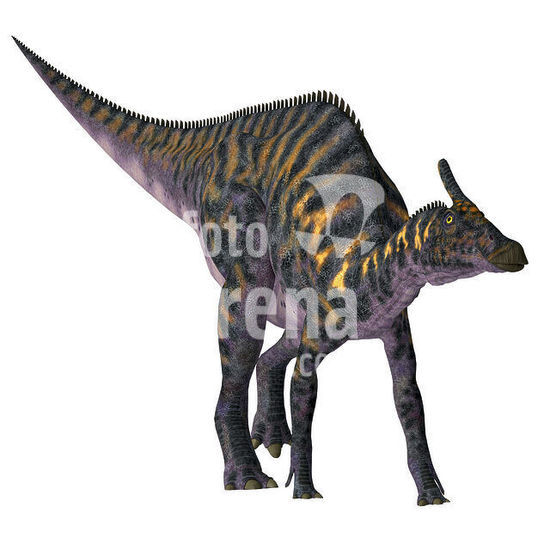 alb5568936 Saurolophus dinosaur, front view. Saurolophus osborni was a Hadrosaur herbivorous dinosaur that lived in Asia and North America during the Cretaceous Period.