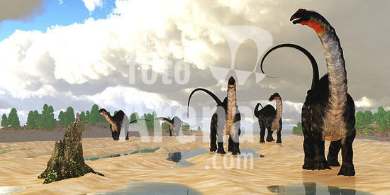 alb5568987 Pteranodon reptiles fly over a herd of Puertasaurus dinosaurs visiting a pond during the Cretaceous Period of Patagonia.