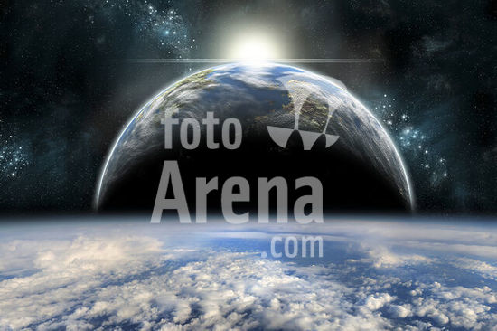 alb5568960 The sun rises over one of a pair of twin planets. Both planets are covered in water and clouds.