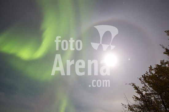 alb5568965 Aurora borealis with full moon and full halo and Venus by Lake Laberge, Whitehorse, Yukon, Canada.