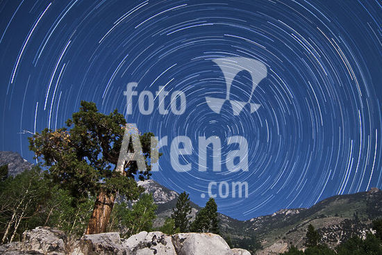 alb5568970 An exposed pine tree on a windswept slope reaches skyward towards north facing star trails, Inyo National Forest, California.