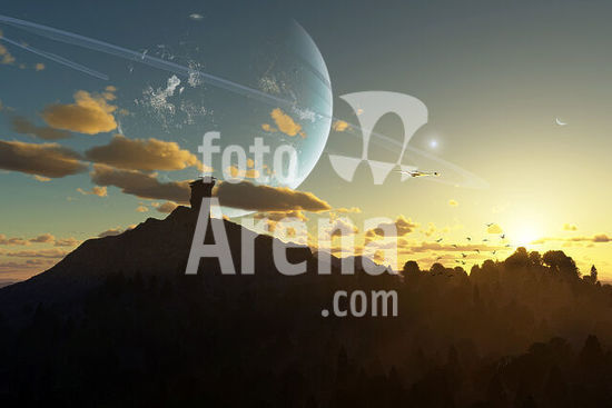 alb5568999 Artist's concept of a sunset on a forested moon which orbits a heavily populated planet. Both the planet and moon orbit around a binary system, consisting of a G class star and a neutron star.