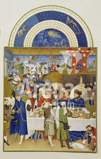 les15020236 Les Tres Riches Heures du Duc de Berry were painted by Pol de Limbourg in 1409 and finished 70 years later by Jean Colombe. January: Jean de France, Duc de Berry at table. A large salt-cellar and two little dogs on the table. Author: Jean Colombe Pol de Limbourg. JEAN COLOMBE POL DE LIMBOURG (15TH). Location: Musee Conde, Chantilly, France.