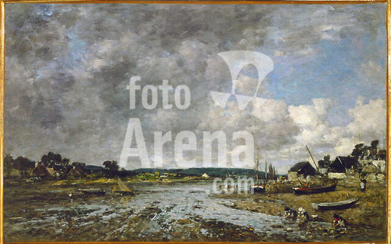 les40110356 Norman Washerwomen on the Shore, Paysage des Lavandieres. Oil on canvas (1873) Inv. RF 1972-16. Author: EUGENE BOUDIN. Location: Musee d'Orsay, Paris, France.