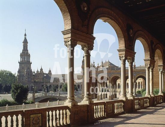 orz128500 VISTA DE LA ZONA CENTRAL DESDE LOS ARCOS - FOTO AÑOS 80. Author: ANIBAL GONZALEZ ALVAREZ-OSORIO (1876-1929). Location: España Square. Sevilla. Seville. SPAIN.
