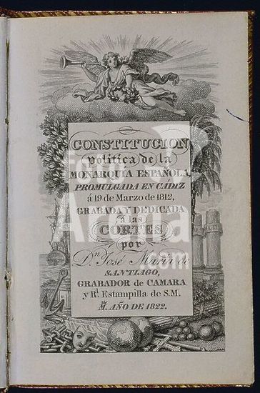 orz210872 CONSTITUCION DE MONARQUIA ESPAÑOLA 1812-PORTADA - 1822. Author: JOSE MARIA DE SANTIAGO (S XIX). Location: CONGRESO DE LOS DIPUTADOS-BIBLIOTECA. MADRID. SPAIN.