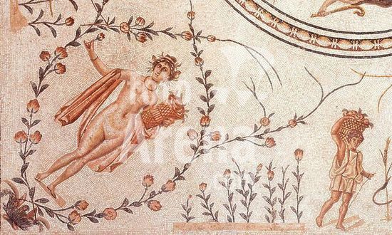 akg1555429 Römisch, 2. Jahrhundert. /-Der Frühling.-/ (Personifikation des Frühlings in Gestalt einer nackten Frau mit einer Blume, gerahmt von Blütenzweigen; rechts ein Rosen sammelnder Knabe). Ausschnitt aus einem Fußbodenmosaik mit Triumph des Neptun, umgeben von den vier Jahreszeiten. Mosaik, Gesamtmaß 4,9 x 4,85 m. Fundo... Museum: Musée du Bardo., Tunis.