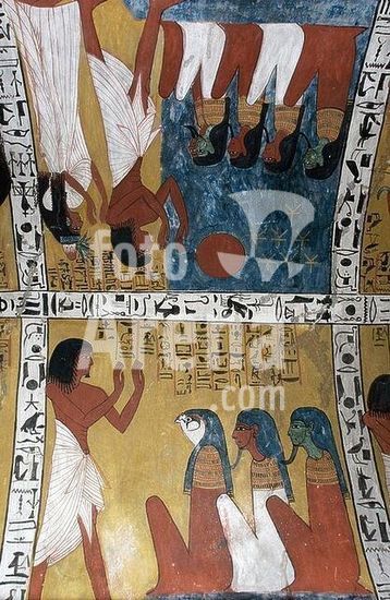akg928553 Ägyptisch, Neues Reich, 19.Dynastie, Zeit Sethos' I./Ramses' II., um 1290 v. Chr. /-Sennedjem in Verehrung des Horus(?) und anderer Götter. / Sennedjem und seine Frau verehren die Himmelsgötter.-/ Deckenmalerei im Grab des Sennedjem, Deir el-Medina (TT 1), Theben-West (Ägypten).