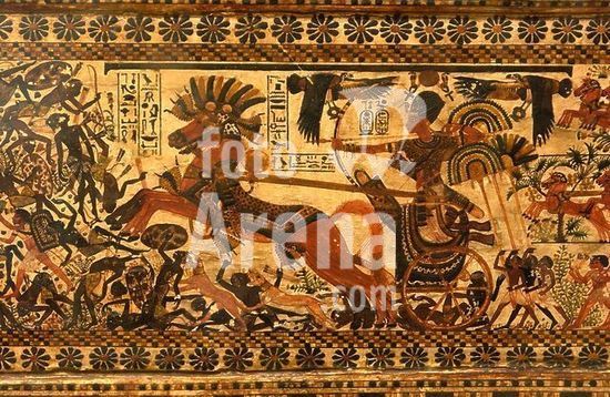 akg869729 Tutankhamen; Egyptian Pharaoh of the 18th dynasty; c.1346-1337 BC.-Tutankhamen in his chariot.-Front of the war and hunting chest. Wood, stuccoed and painted, overall dimensions h.44cm, w.44cm, l.61cm. Found at: Thebes West, Valley of the Kings, Tomb of Tutankhamen (KV 62), Inv.no. JE 61467. Museum: Egyptian Museum., KAIRO.