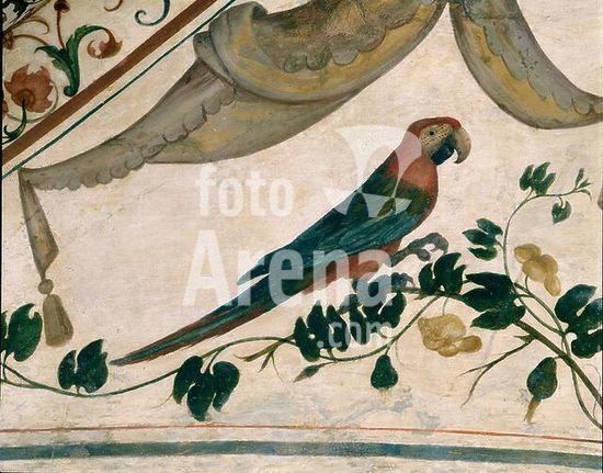 akg994492 Florence-Firenze (Tuscany, Italy), Palazzo Vecchio, 2nd floor, Quartiere di Eleonora da Toledo, Green room-Camera verde.-Detail from the ceiling painting with grotesques: Parrot.-Fresco, 1540/42, by Ridolfo Ghirlandaio (1483-1561).