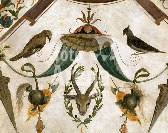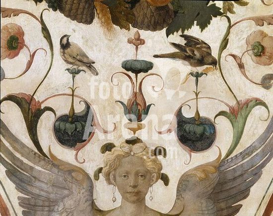 akg994499 Florence-Firenze (Tuscany, Italy), Palazzo Vecchio, 2nd floor, Quartiere di Eleonora da Toledo, Green room-Camera verde.-Detail from a ceiling painting with grotesques.-Fresco, 1540/42, by Ridolfo Ghirlandaio (1483-1561).