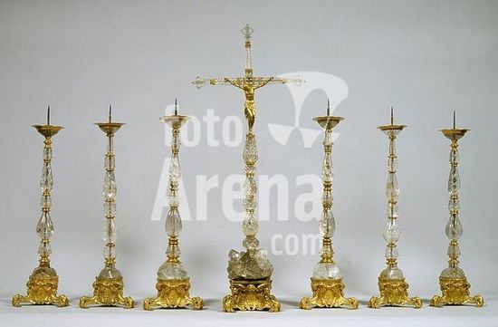 akg995421 Florenz / Firenze (Toskana, Italien), Kirche Santissima Annunziata.-Altarsatz: Altarkreuz und sechs Leuchter von Pietro Tacca (1577-1640) und Cosimo Merlini (gest.1736). Bronze, vergoldet, und Bergkristall.