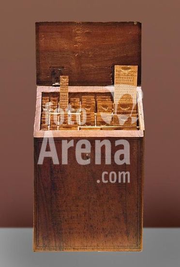 akg1125456 Musik / Instrumente: Musikautomaten.-Arca Musarithmica.-Komponiermaschine, Rom, um 1650, von Athanasius Kircher ( 1602-1680). Holz, geklebt, Papier, Metall, Tinte, H. 16,6-23 cm, B. 14,35 cm, T. 5,3 cm. Inv.Nr. Cod.Guelf.90.Aug.8°. Museum: Herzog August Bibliothek., WOLFENBUETTEL.