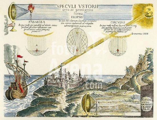 akg1350469 Kircher, Athanasius 1601-1680. Werke: Ars Magna Lucis et Umbrae, 1671.-Illustration: Wirkung des Hohl-und Brennspiegels.-Kupferstich. Spätere Kolorierung.