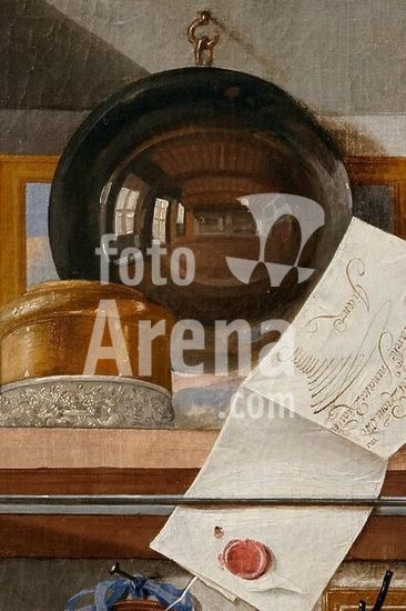 akg1007213 Remps, Domenico; um 1610-um 1699. "Scarabattolo" (Kunst-und Wunderkammerschrank mit Objekten der mediceischen Sammlungen), 2.Hälfte 17.Jahrhundert. Ausschnitt, oberes Fach, links: Brief an den Marchese Francesco Riccardi und Konvexspiegel.-/ (Trompel'oeil). Öl auf Leinwand, 99 x 136 cm. Museum: Opicifio delle Pietre dure., Florenz.