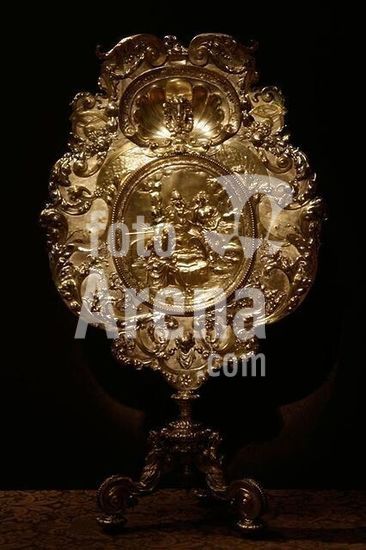 akg927836 Silberschmiedekunst, 18.Jahrhundert.-Silberschmiedearbeit mit Relief "Venus in der Schmiede des Vulkan".-Silber, vergoldet. Museum: Grünes Gewölbe., DRESDEN.