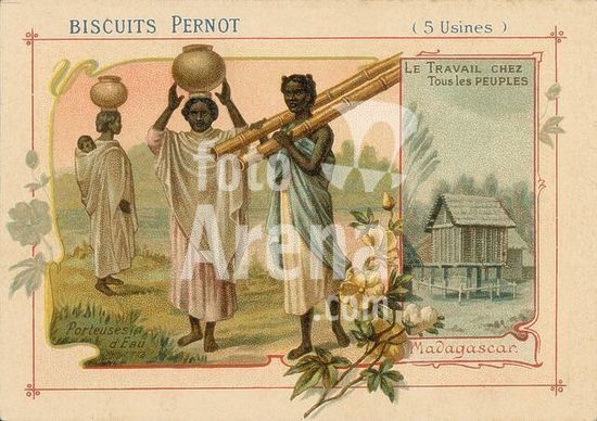akg916164 Völkerkunde / Madagaskar.-"Madagascar / Porteuses d'Eau".-(Wasserträgerinnen in Madagaskar). Farblithographie, anonym, Frankreich, um 1900. Sammelbildcher der Firma "Biscuits Pernot". Aus Serie: "Le Travail chez tous les peuples". Museum: Private Collection., Paris.