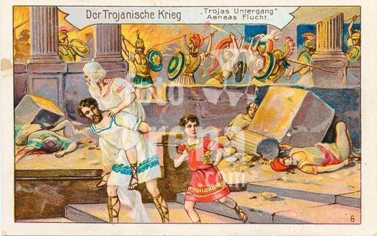 akg1641900 Mythologie / griechischrömisch / Trojanischer Krieg.-"`Trojas Untergang'-Aeneas Flucht".-(Flucht des Äneas mit seinem gelähmten Vater Anchises und seinem Sohn Askanius aus dem brennenden Troja).-(Vergil, Aeneis II, 720-732). Farblithographie, undat., um 1905(?). Sammelbildchen der Firma Heinrich Franck Söhne ( ...