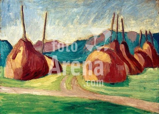 akg1088058 Macke, Helmuth 1891-1936. "Heuhocken in Sindelsdorf", um 1909. Tempera auf Pappe, 50 x 70 cm. Privatbesitz.