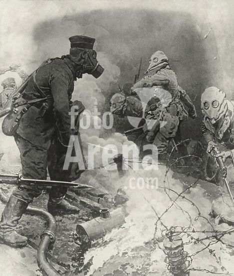 akg1938651 World War I / Gas attack.-"Fighting in the Death Mist" (British advance during a German gas attack).-Print after an illustration by Fortunino Matania (1881-1963).