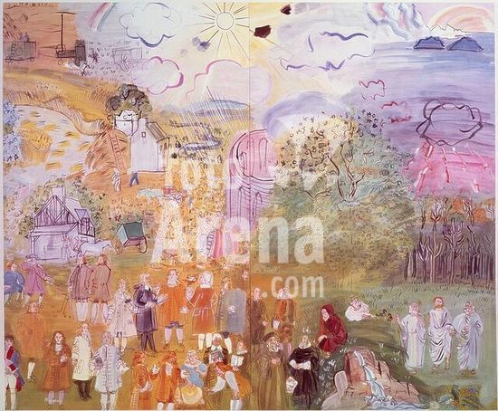 akg928969 Dufy, Raoul; 1877-1953. "La Fée Electricité", 1952-53. Gouache on two lithographs, mounted on isorel, 99 x 125 cm. / (Allegory on electricity. One of 5 panels after Dufy's 600m? painting for the "Palais d'Electricité et de la lumière" of the Parisian World's Fair, 1937). AM1935D(5). / Centre Georges Pompidou,. Museum: Musée National d'Art Moderne., Paris.